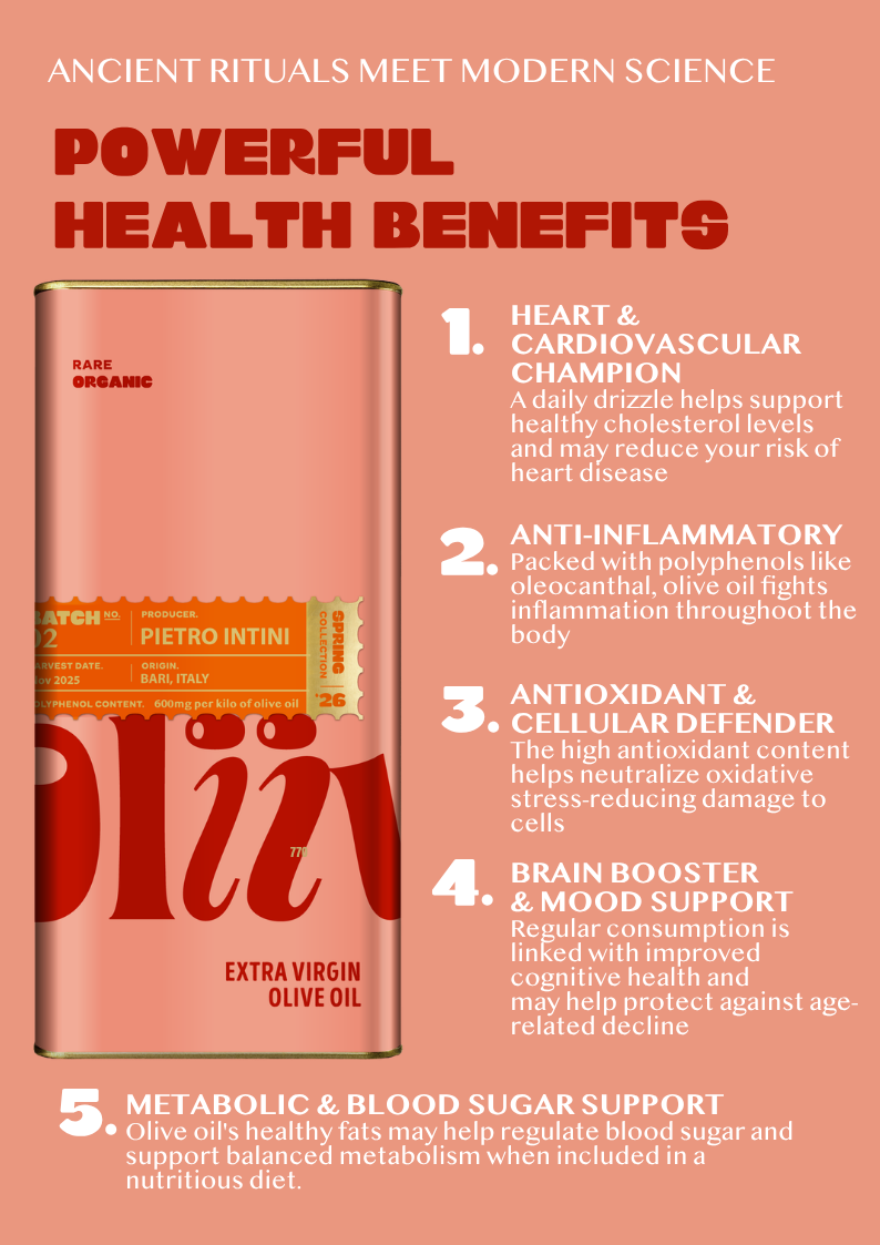An ancient elixir backed by modern science. Oliiv is full of potent antioxidants, helping to neutralise free radicals and support cellular longevity, making Extra Virgin Olive Oil one of the most scientifically validated "functional foods" for preventing chronic metabolic and neurodegenerative conditions.